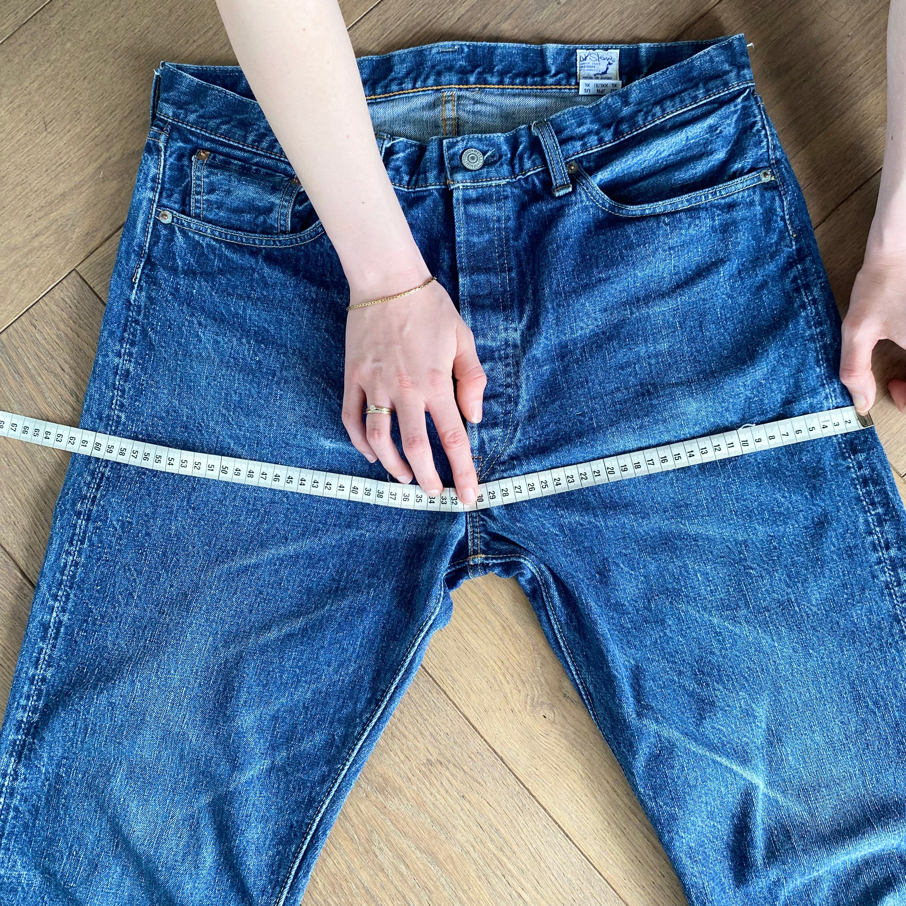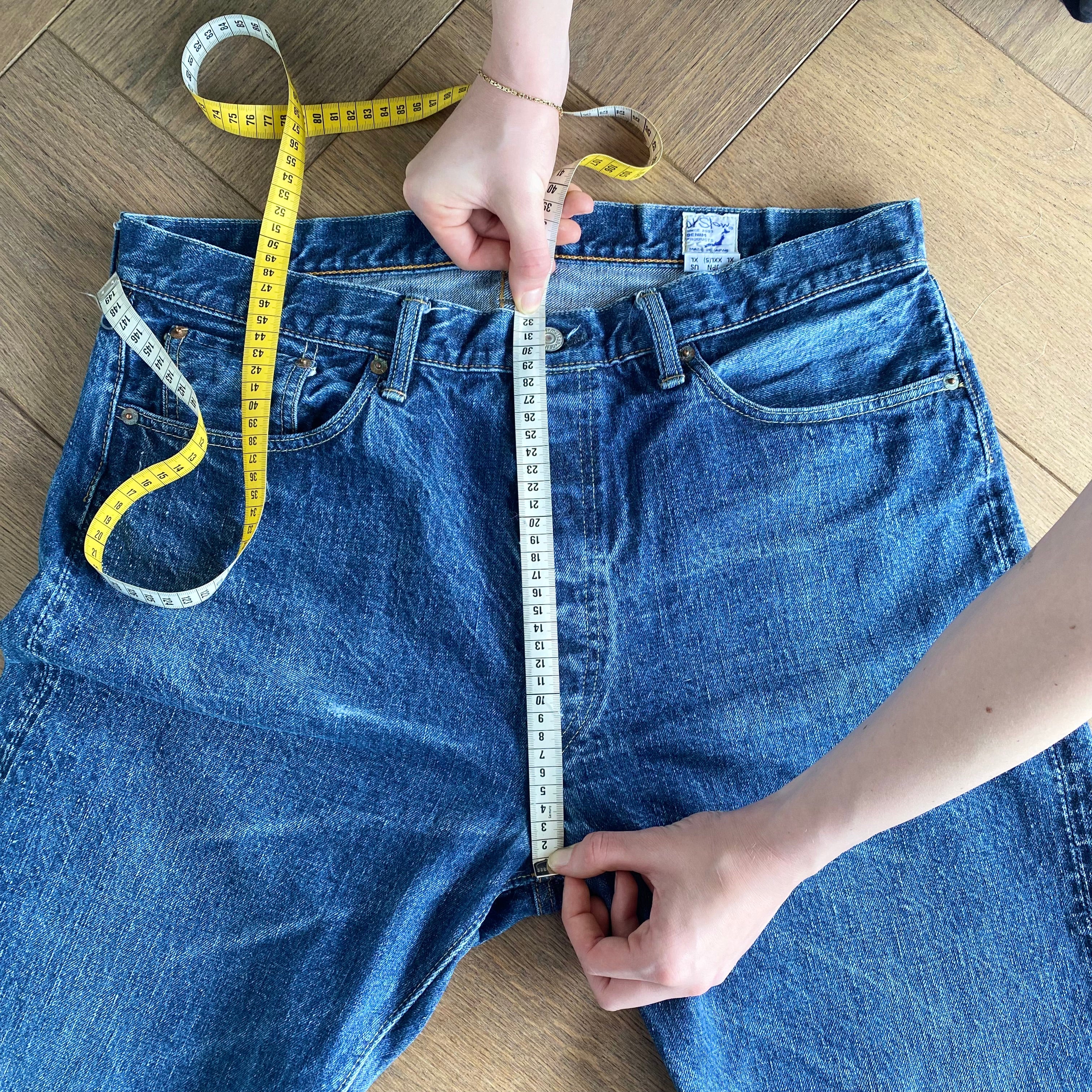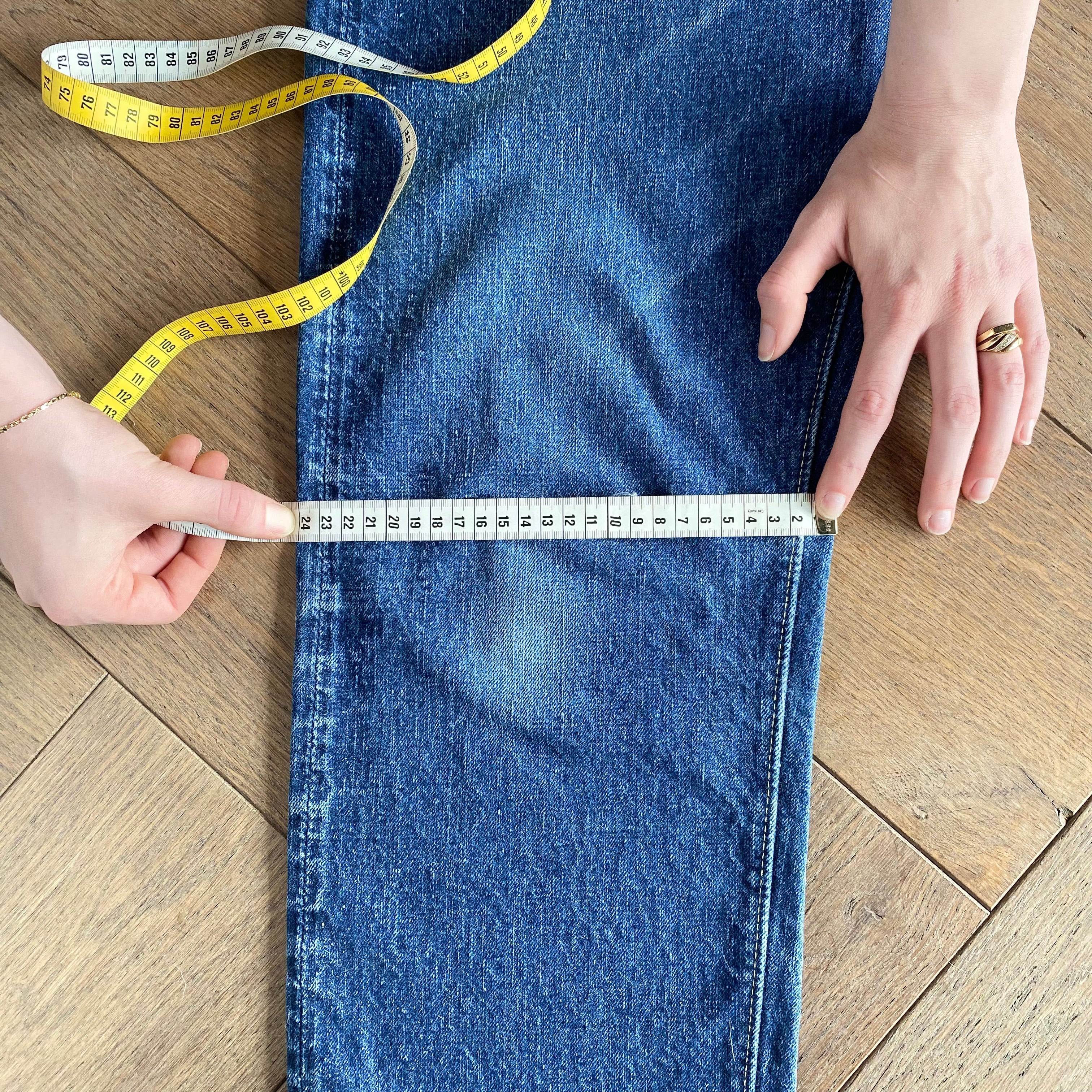 For the waist measurement, lay your jeans flat and buttoned, then measure from side to side at the top of the waistband.