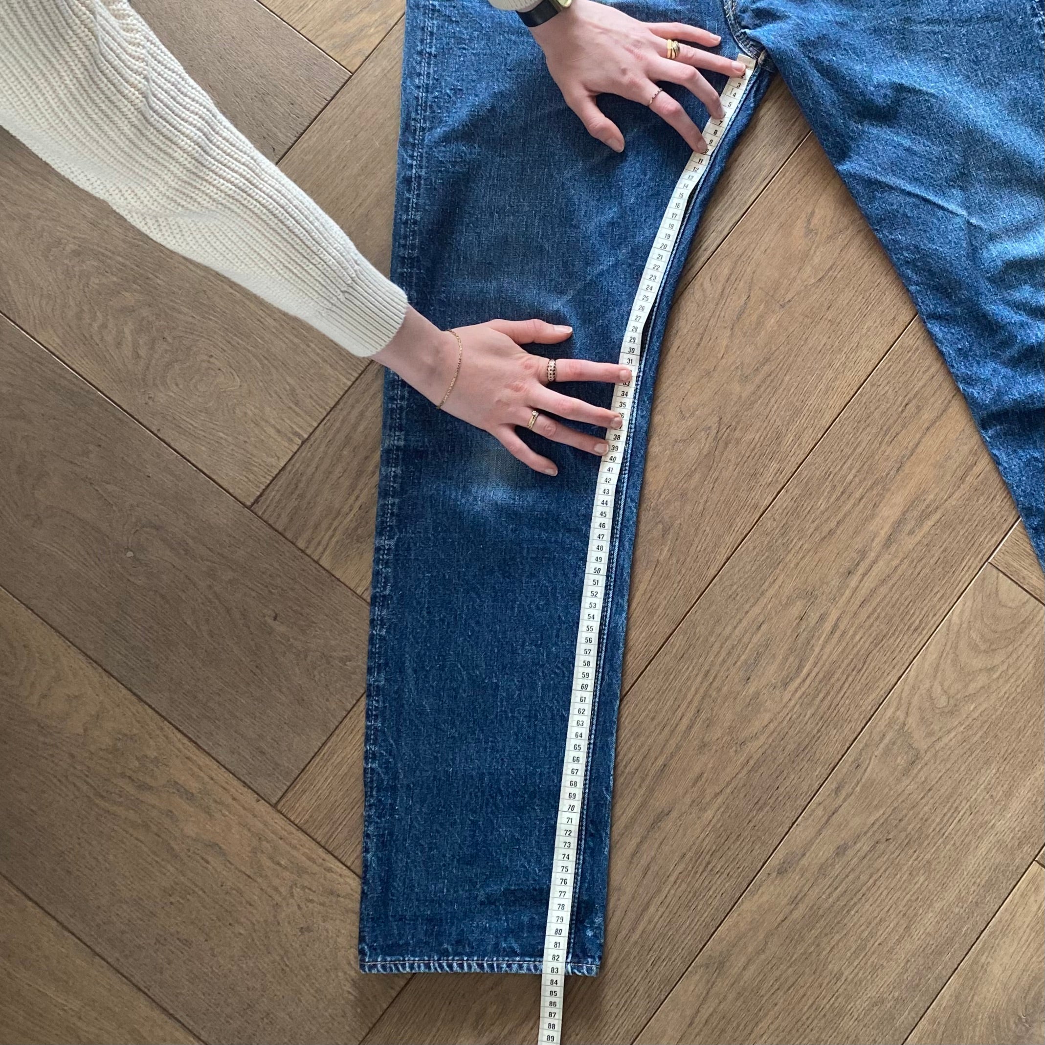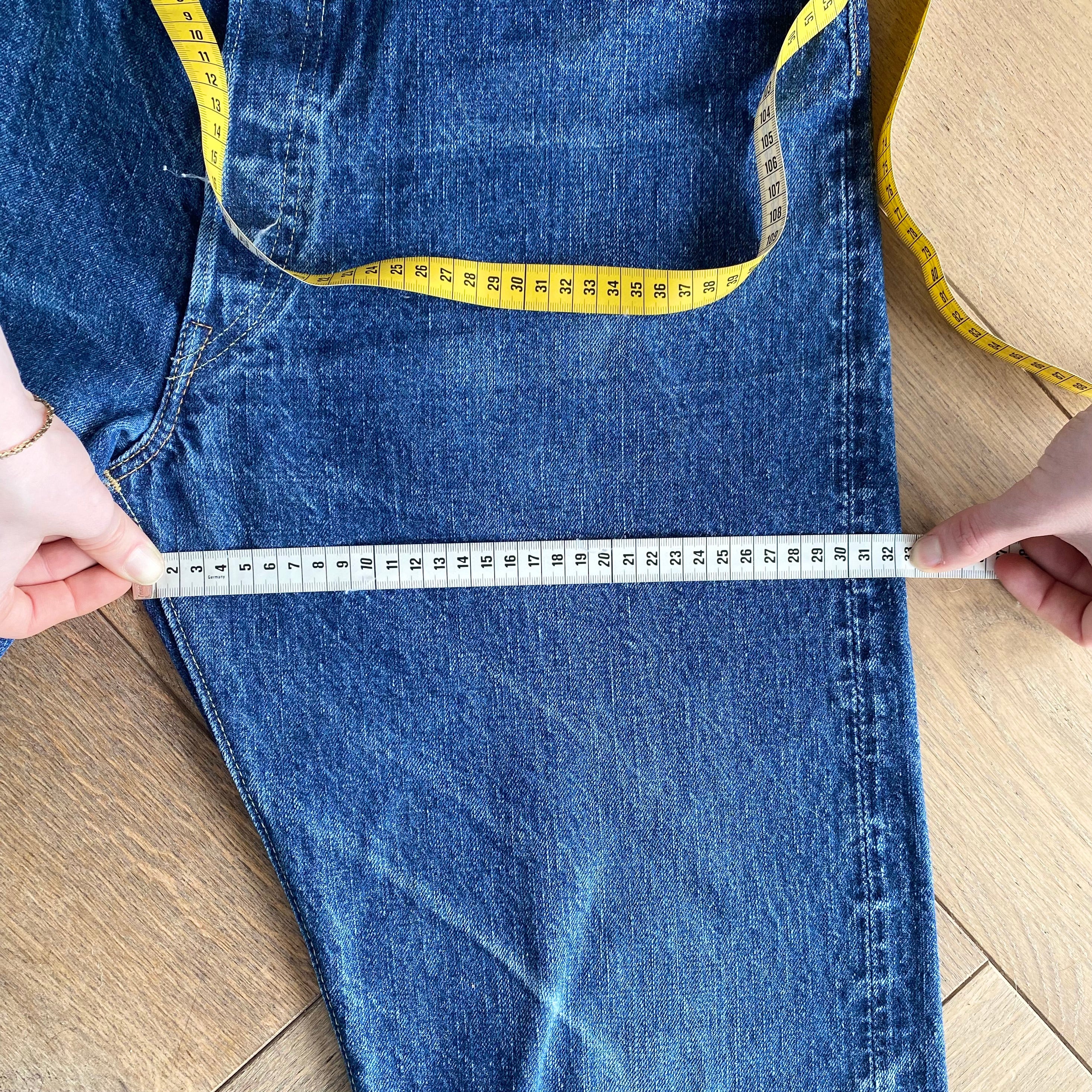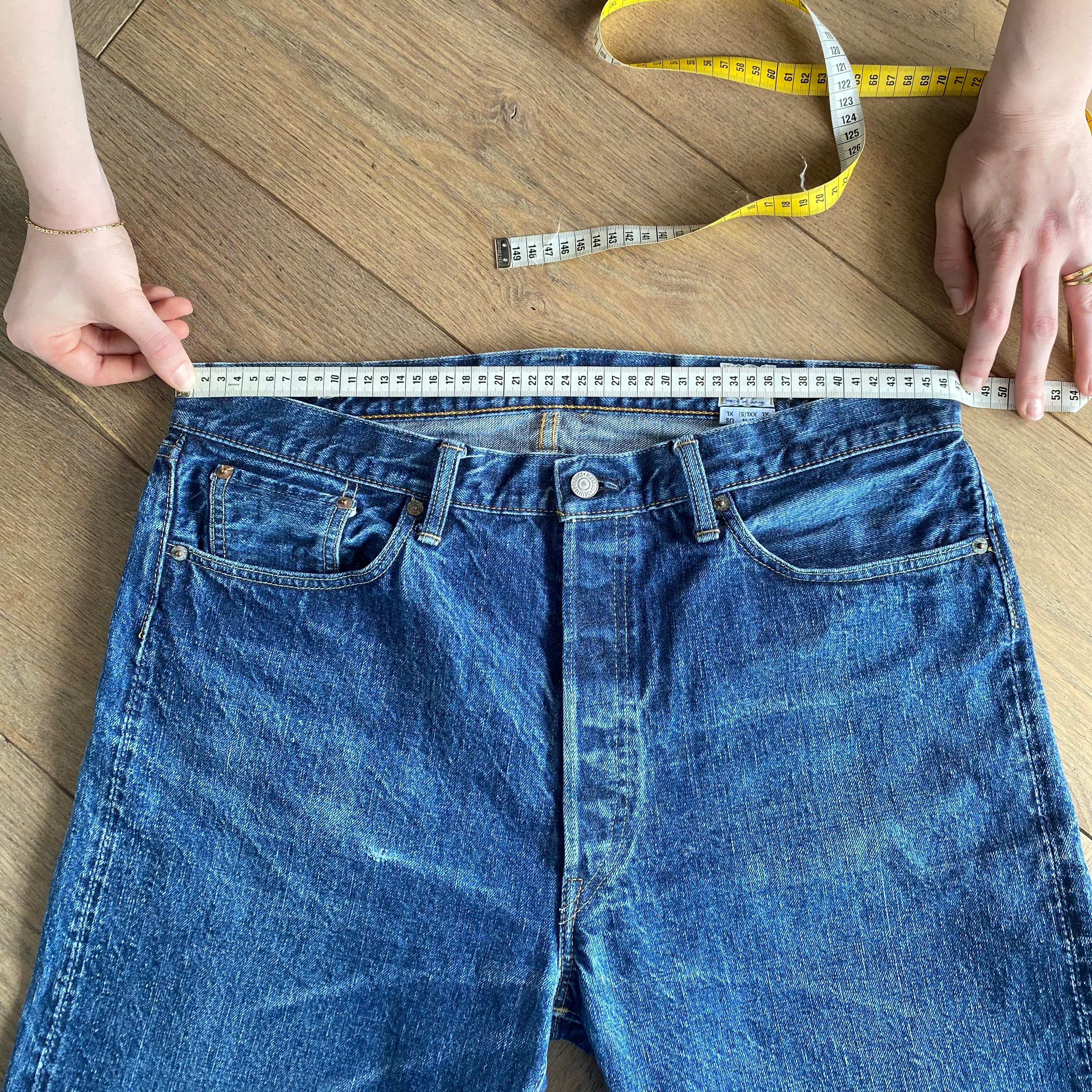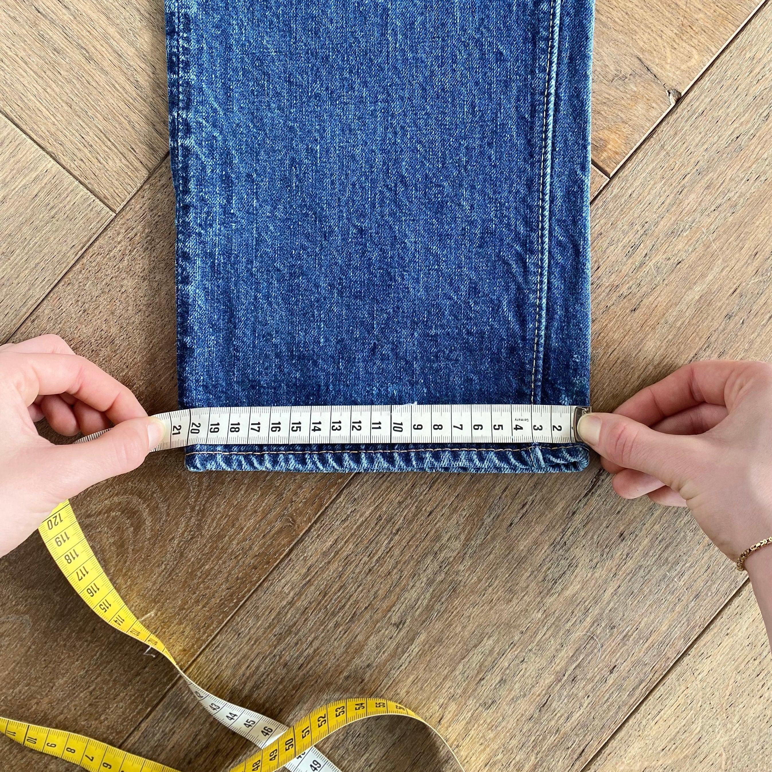 For the waist measurement, lay your jeans flat and buttoned, then measure from side to side at the top of the waistband.